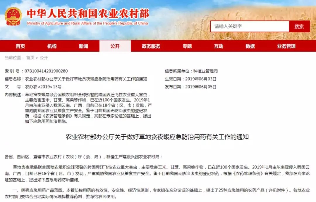 6月4日,农业农村部网站发布《关于做好草地贪夜蛾应急防治用药有关工作的通知》,《通知》指出,草地贪夜蛾2019年1月由东南亚侵入我国云南、广西,目前已在18个省(区、市)发现,严重威胁我国农业及粮食生产安全。