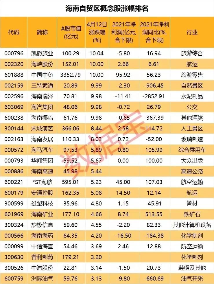 4月13日,海南自贸区(港)建设将迎来4周年;另外,博鳌亚洲论坛2022年年会将于4月20至22日在海南博鳌举行。目前,海南自贸港全岛封关准备工作已全面启动,自贸港建设进入加速期。12日,海南自贸区概念表现强势,多股涨停。
