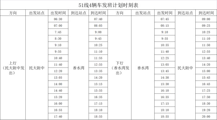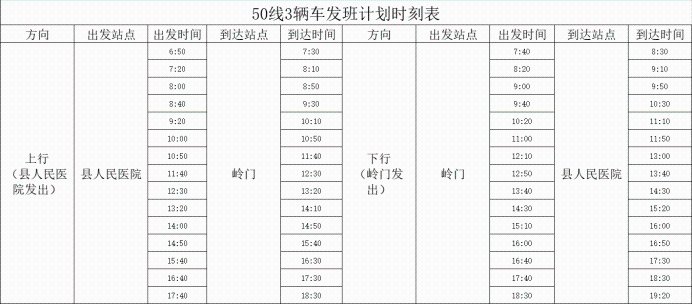 首班:6:50分,末班:17:40分,发班间隔:40-60分钟