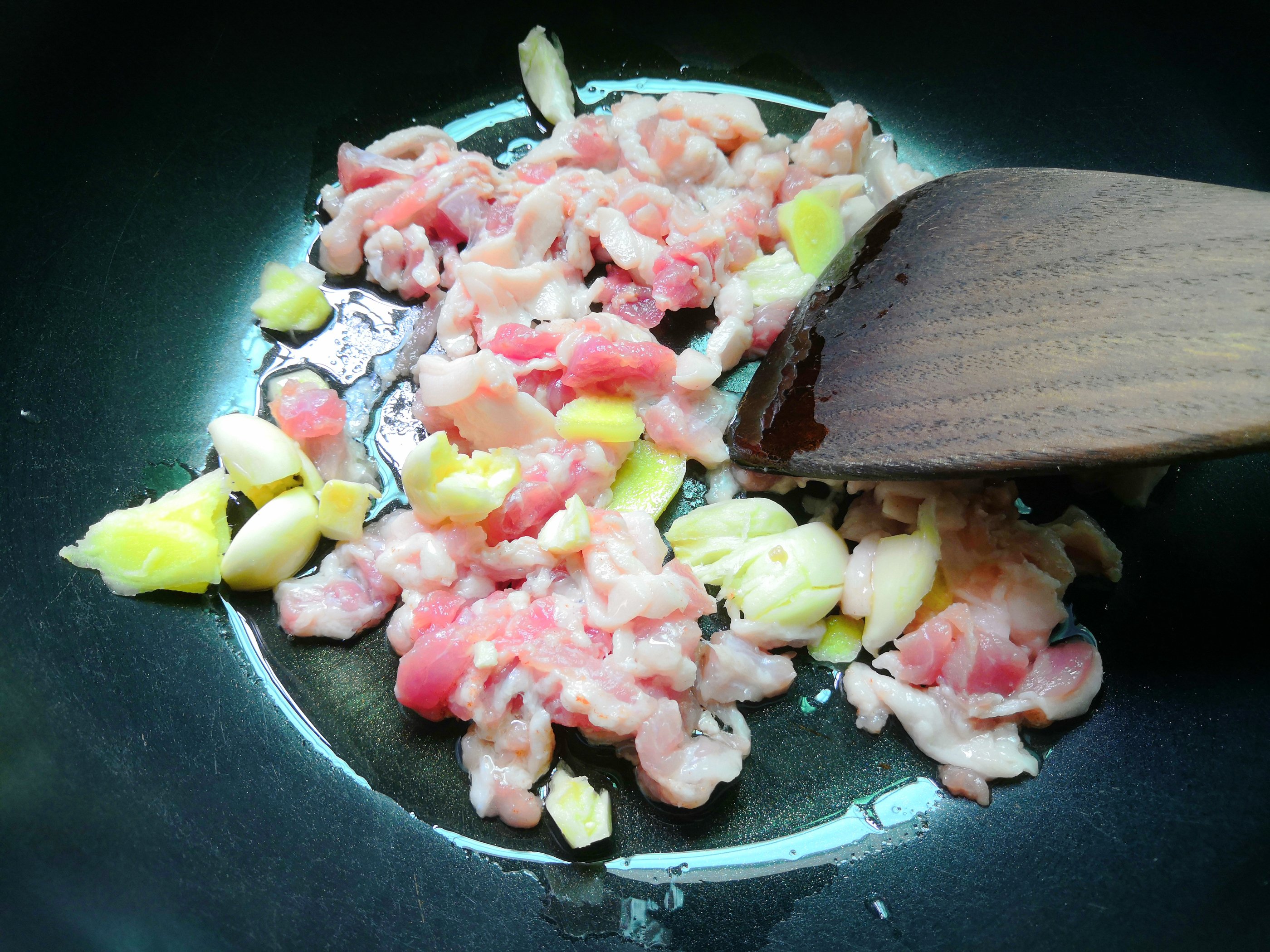 五花肉去皮洗净切成小丁,加入油锅内,加入姜蒜葱炒至出油。