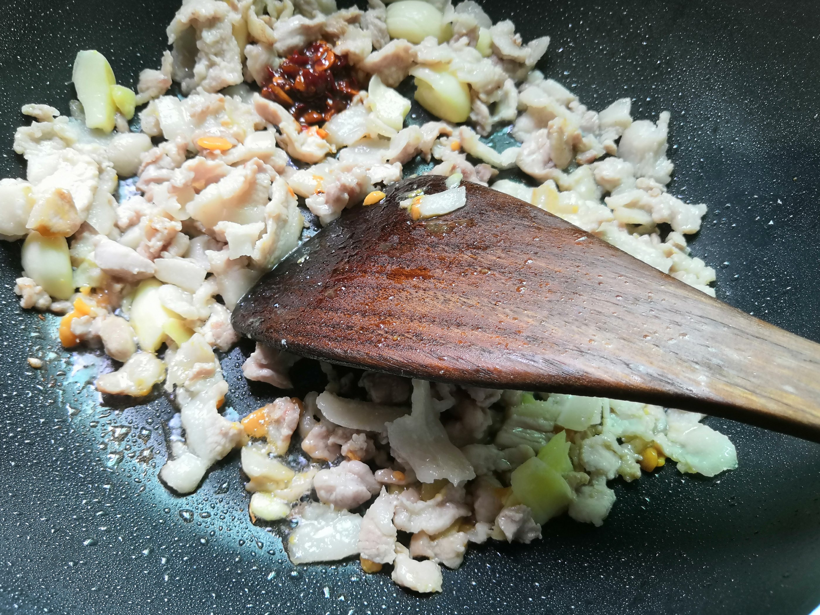 盛起一部分备用炒其他的菜,留少许炒苦瓜就可以了,不要太油腻的。