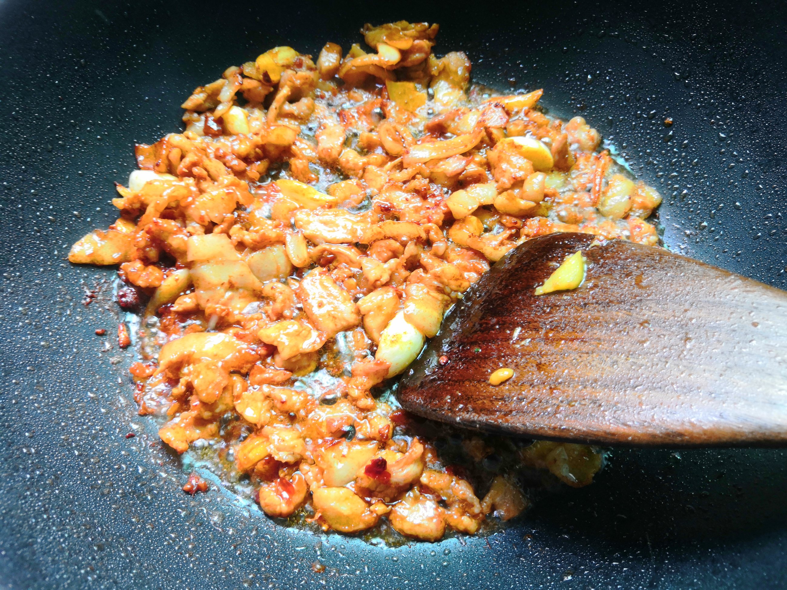 加入黄豆酱,豆瓣酱,生抽,料酒,陈醋等炒香。