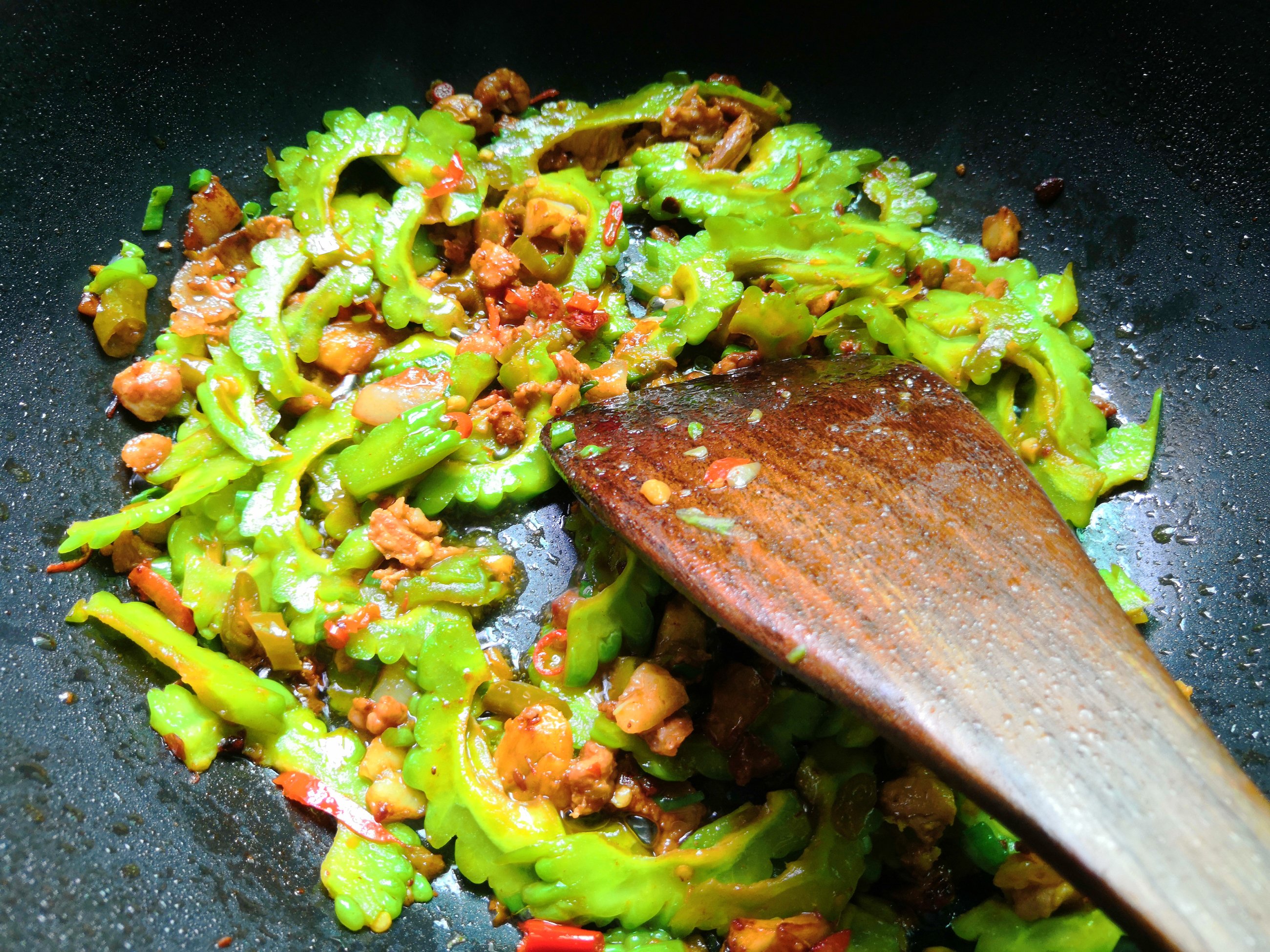 加入苦瓜快速炒变色,加入少许盐,糖炒匀。