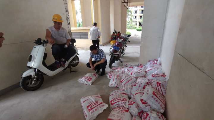 7月24日上午,商报记者来到时代城27栋装修现场看到,该栋楼确实有不少房屋正在装修,装修声此起彼伏,一楼过道处堆满了腻子粉、沙子、胶水等装修材料。小唐所反映的疑似不合规胶水正堆放在此。