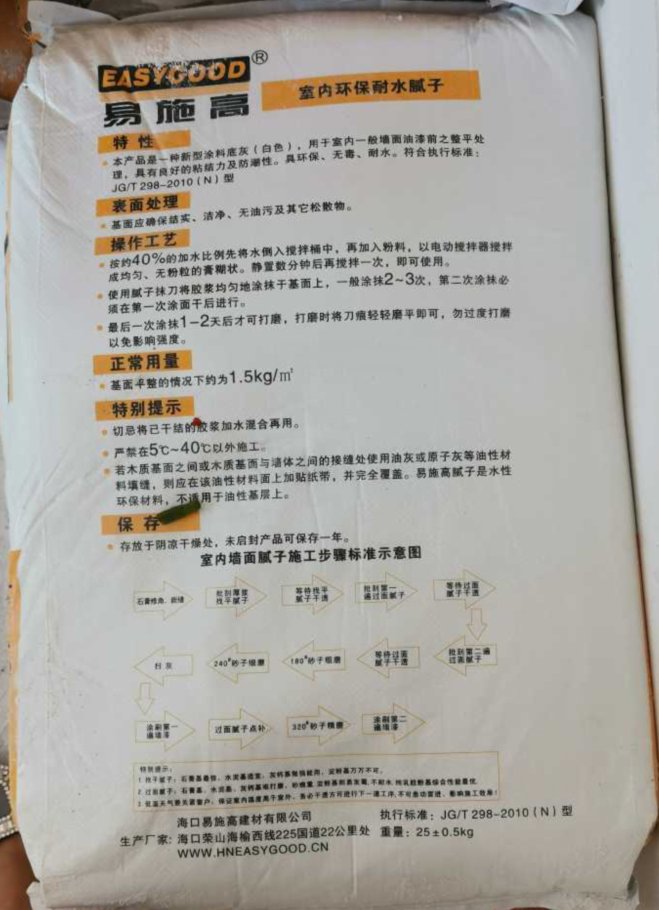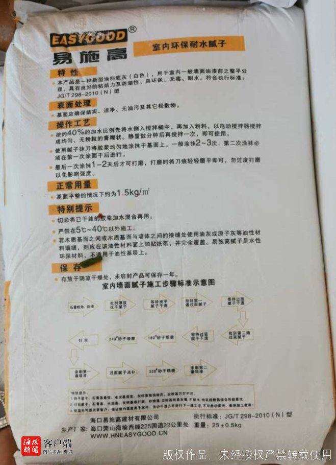 目前,海口市市场监督管理局长流市场监管所执法人员已介入调查。对于施工现场所使用的“易施高”室内环保耐水腻子包装上标注地址和注册地址为何不一致?“保宁”牌胶水产品质量是否合格?商报记者将继续关注。