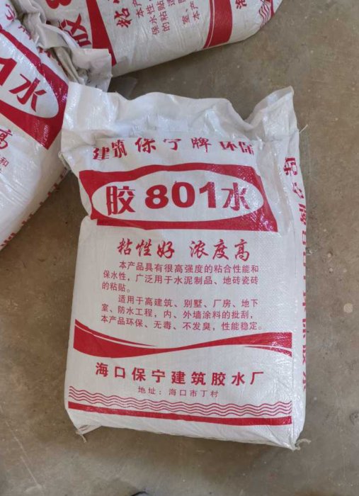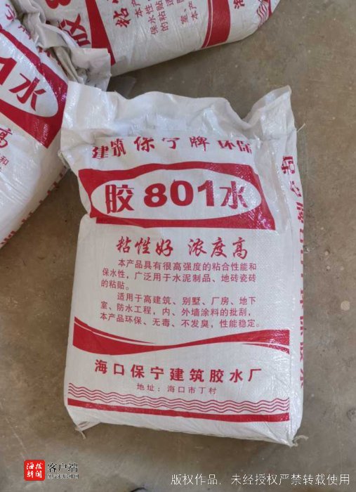 记者注意到这款建筑胶水包装上标注有801胶水,有粘性好、浓度高,本产品环保、无毒、不发臭,性能稳定等宣传字样,生产厂家为海口保宁建筑胶水厂,地址仅标注为海口市丁村,但无具体生产地址。包装上未见生产日期,规格、执行标准等有效信息。