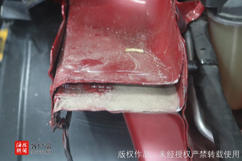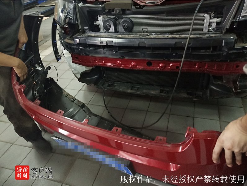 8月8日,为了进一步维权,车主陈女士聘请了第三方机构进行车辆检测,商报记者同车主陈女士、第三方机构以及海口鑫安盛贸易有限公司(中国人保车险合作的车辆旧件回收公司)有关负责人一同来到海南中汽南方汽车销售服务有限公司,同路虎4S店售后负责人一起对陈女士的路虎车进行拆卸检测。