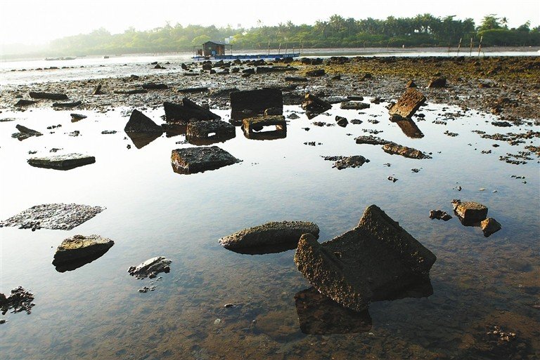 海口演丰镇林市村一带琼北大地震遗址。退潮时,海底村庄露出水面。记者李幸璜摄