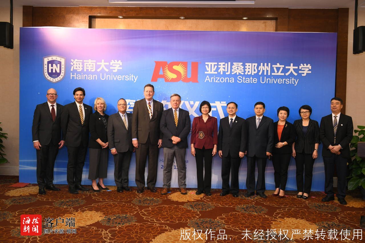 商报全媒体讯(椰网/海拔手机端记者 王茹 摄影报道)为深入推进海南大学与美国亚利桑那州立大学建立战略合作伙伴关系,扩大中外合作办学项目,推进海南大学观澜湖校区建设,11月5日,亚利桑那州立大学校长麦克克罗率代表团访问海南大学。据悉,海南大学与亚利桑那州立大学将利用双方资源,在海南大学观澜湖校区建设具有国际影响力和新概念的国际化学院。双方拟开展合作学科领域包括国际贸易、金融、会计、大数据应用、艺术与设计等专业。此外,双方同意首先在观澜湖校区以建设雷鸟国际贸易学院起步,包括本科和硕士项目,专业领域包括国际贸易、金融、会计等。