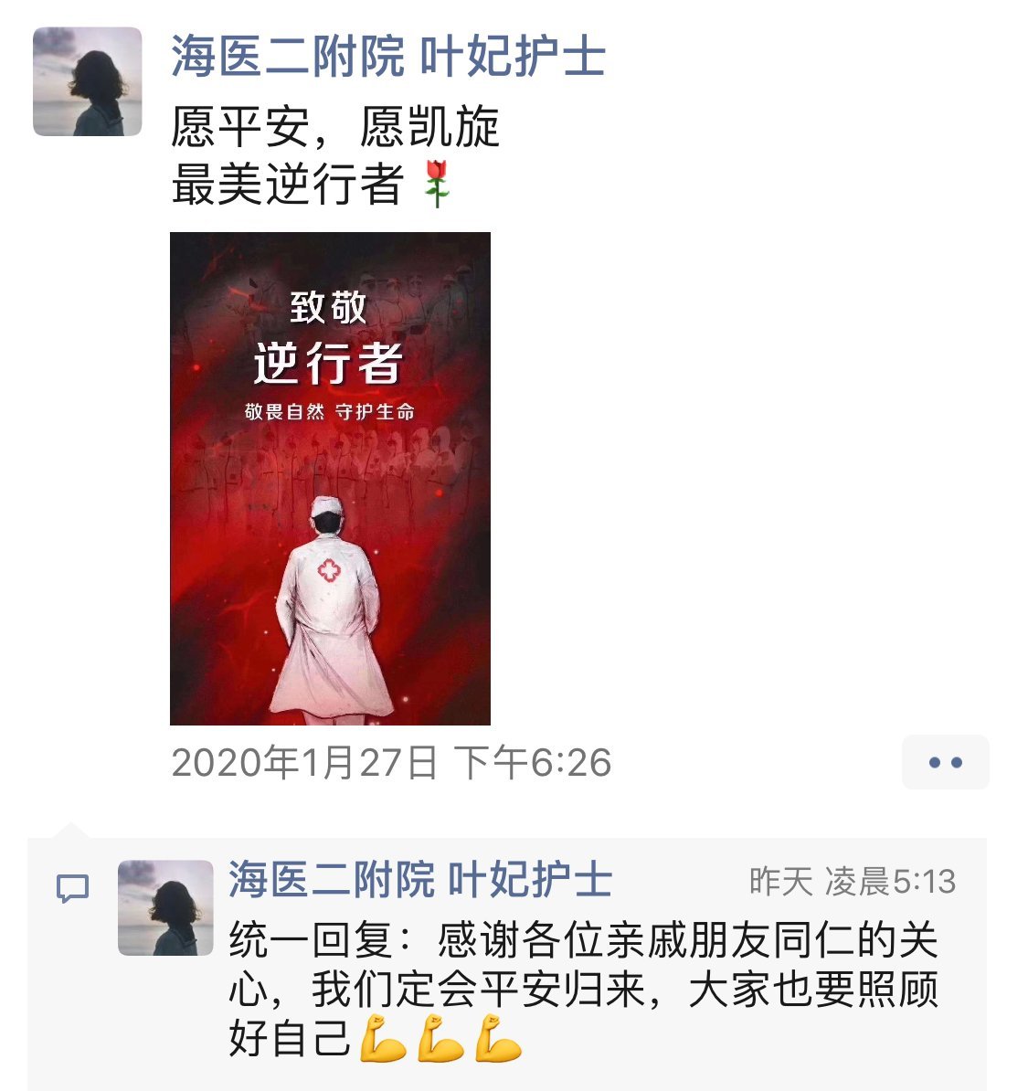 商报全媒体讯 (椰网/海拔手机端记者 王茹) “愿平安,愿凯旋。”1月27日18时26分,叶妃在飞往湖北省荆州市途中发了这样一条朋友圈。这次海南医学院第二附属医院驰援湖北荆州抗击新型冠状病毒感染的肺炎,她便是医疗队的其中一员。从事护师工作近10年的她经验丰富,但面对这场“战役”她仍不敢掉以轻心,叶妃说,这是一场不容松懈的持久战,她虽然有些紧张,但也有信心打场“胜仗”。