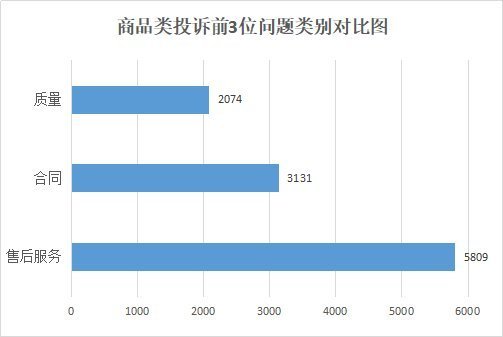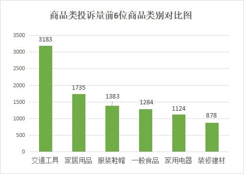 商品类投诉量前6位商品类别排名分别为:交通工具3183件、家居用品1735件、服装鞋帽1383件、一般食品1284件、家用电器1124件、装修建材878件,反映的投诉问题类别主要集中在售后服务、合同、质量三个方面。