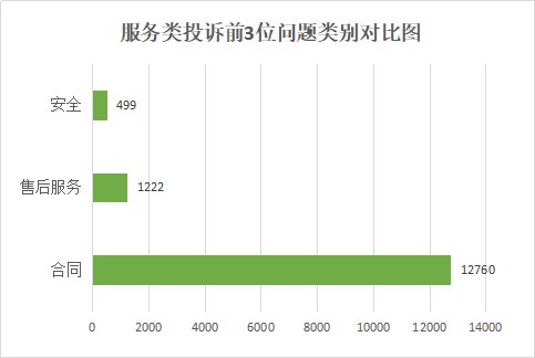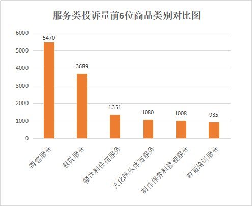服务类投诉量前6位商品类别排名分别为:销售服务5470件、租赁服务3689件、餐饮和住宿服务1351件、文化娱乐体育服务1080件、制作保养和修理服务1008件、教育培训服务935件,反映的投诉问题类别主要集中在合同、售后服务、安全三个方面。