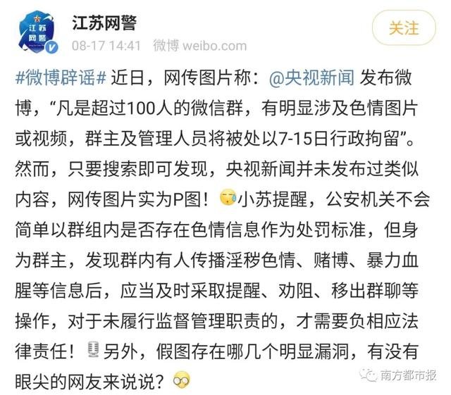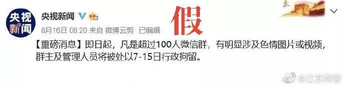 今天,一张图片疯传。网传图片称“@央视新闻发布微博,‘凡是超过100人的微信群,有明显涉及色情图片或视频,群主及管理人员将被处以7-15日行政拘留’”。