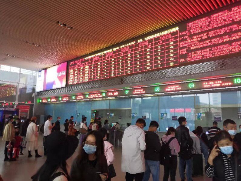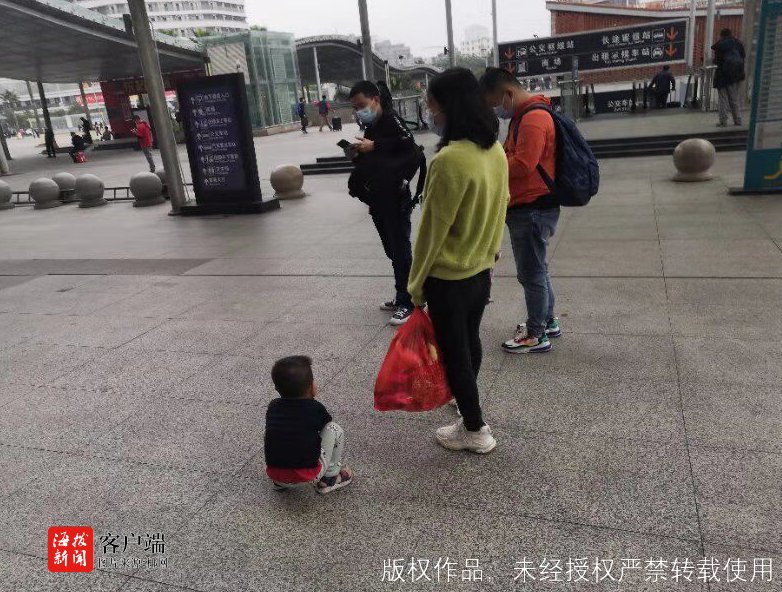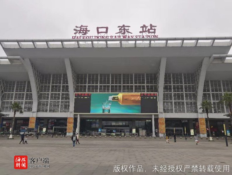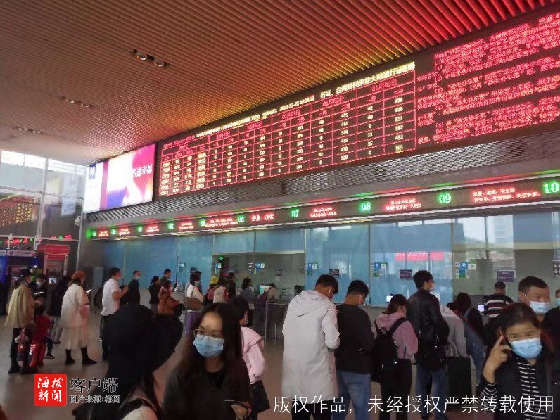 下午,海口高铁东站内人潮涌动,有的拖着行李箱匆忙赶路、有的正在打电话寻找朋友、还有的正在安抚哭闹孩子……