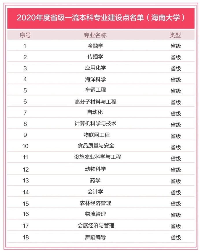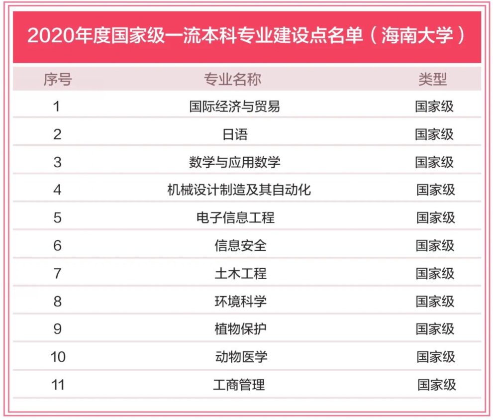 商报全媒体讯(椰网/海拔手机端记者 魏铭纬 通讯员 耿刚)国际旅游岛商报记者3月3日从海南大学获悉,根据《教育部办公厅关于公布2020年度国家级和省级一流本科专业建设点名单的通知》,该校11个专业入选国家级一流本科专业建设点,18个专业入选省级一流本科专业建设点。