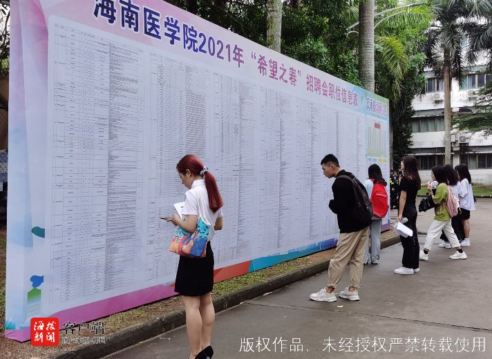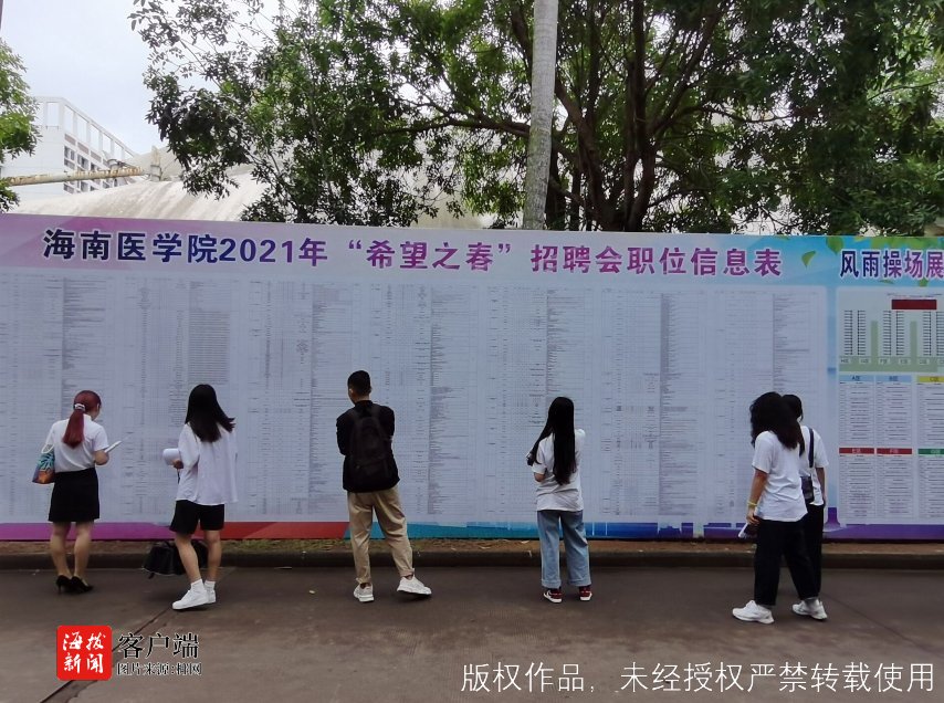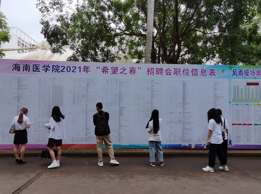 商报全媒体讯(椰网/海拔手机端记者 许文玉 摄影报道)2021年4月10日上午,海南医学院“希望之春”招聘会在该校风雨操场举行,约1800名毕业生参加了招聘会,现场共有116家优质的企事业单位,提供2500个优质岗位供广大毕业生选择。各用人单位共计约收到简历2000余份,组织小型专场招聘会20场。