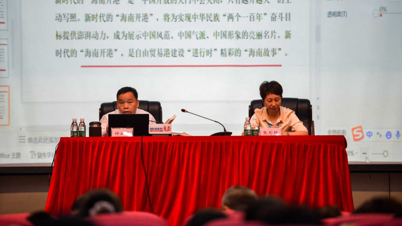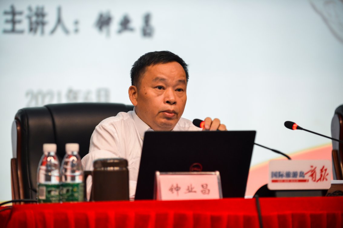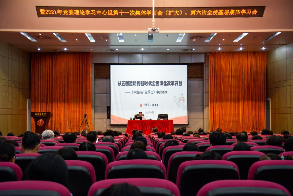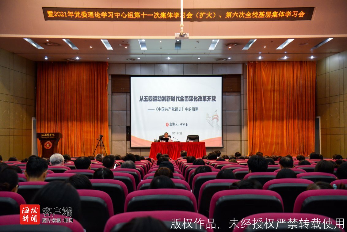 商报全媒体讯(椰网/海拔手机端记者 徐明锋 魏铭纬 史若木 刘宁玥)致敬光辉岁月,奋进美好时代。6月11日下午,海南医学院举行党史学习教育专题学习会。海南省社科联党组书记、主席,省社科院院长,省史学会会长钟业昌担任主讲,在连续四个小时中作了题为《从五四运动到新时代全面深化改革开放——〈中国共产党简史〉中的海南》的党史学习教育专题报告。海南医学院党委副书记、校长杨俊等校领导及师生代表等700多人参加学习。海南医学院党委委员、副校长张彩虹主持报告会。