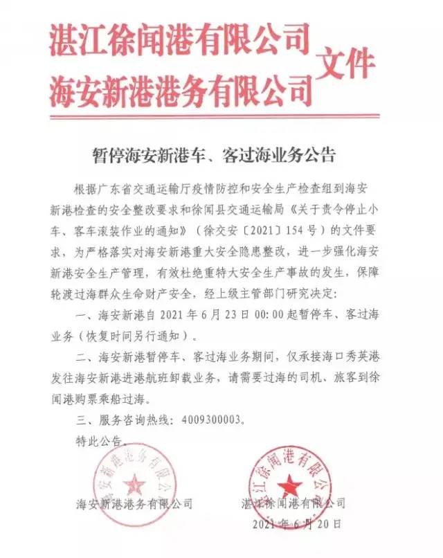@入琼司机、旅客,广东海安新港自6月23日零时起暂停车、客过海业务。详细>>>