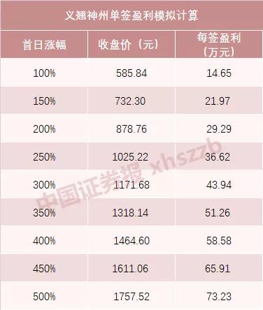 若首日涨幅达到100%,义翘神州的单签盈利可达14.65万元;若首日涨幅达到200%,单签盈利可达29.29万元;若首日涨幅达到242%,则义翘神州的股价将超过1000元,中一签可赚超35万元。
