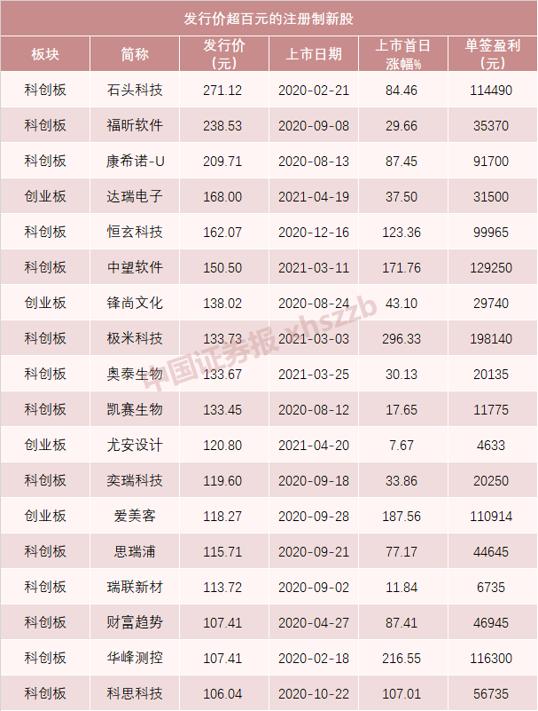 在已经上市的注册制新股中,发行价超过百元的新股共有18只,上市首日收盘平均涨幅为91.69%,平均单签盈利6.5万元。其中,打新收益最高的新股是极米科技,单签盈利为19.81万元。