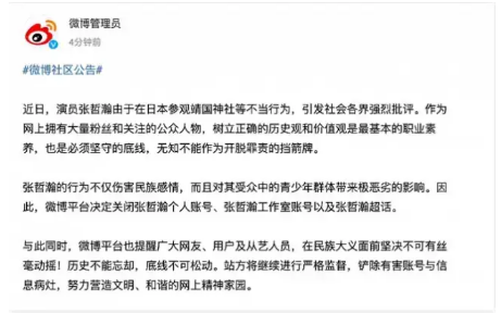 无知不是借口!中演协要求对张哲瀚进行从业抵制。演员张哲瀚在日本参观靖国神社等不当行为,近日被披露并引发各界的强烈关注。中国演出行业协会依规启动行业道德自律评议。15日,@微博管理员发布公告称,张哲瀚的行为不仅伤害民族感情,而且对其受众中的青少年群体带来极恶劣的影响。因此,微博平台决定关闭张哲瀚个人账号、张哲瀚工作室账号以及张哲瀚超话。详细>>>