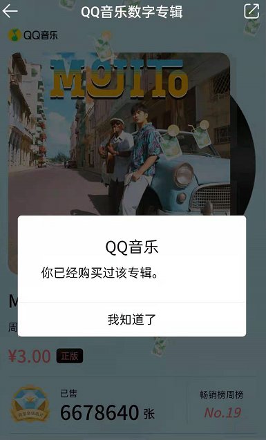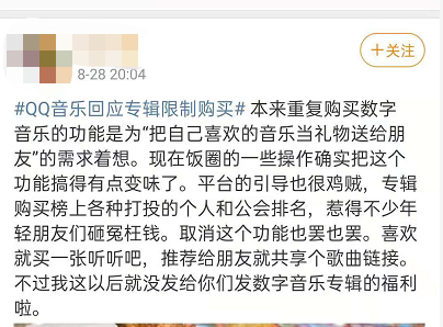 8月27日晚,有用户发现已购买的专辑无法重复购买。QQ音乐也取消了人气榜、音乐巅峰榜等涉明星艺人排行的非作品类排名。