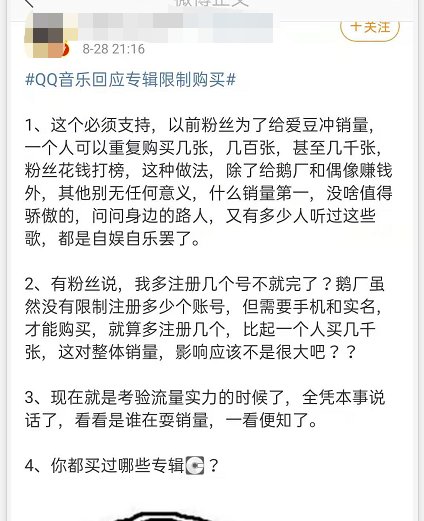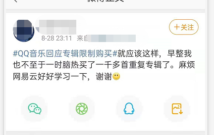QQ音乐确定对数字专辑的购买数量进行了“限制购买”之后,网友纷纷表示支持。有网友喊话网易云音乐,什么时候学学?