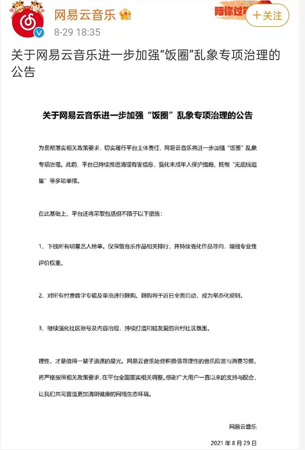 8月29日,网易云音乐就“安排”了!当日,网易云音乐官方微博发布了《关于网易云音乐进一步加强“饭圈”乱象专项治理的公告》。公告称,网易云音乐将采取包括但不仅限于以下措施: