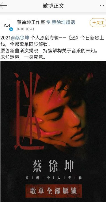 8月30日上午,蔡徐坤工作室宣布,《迷》新歌全部上线。