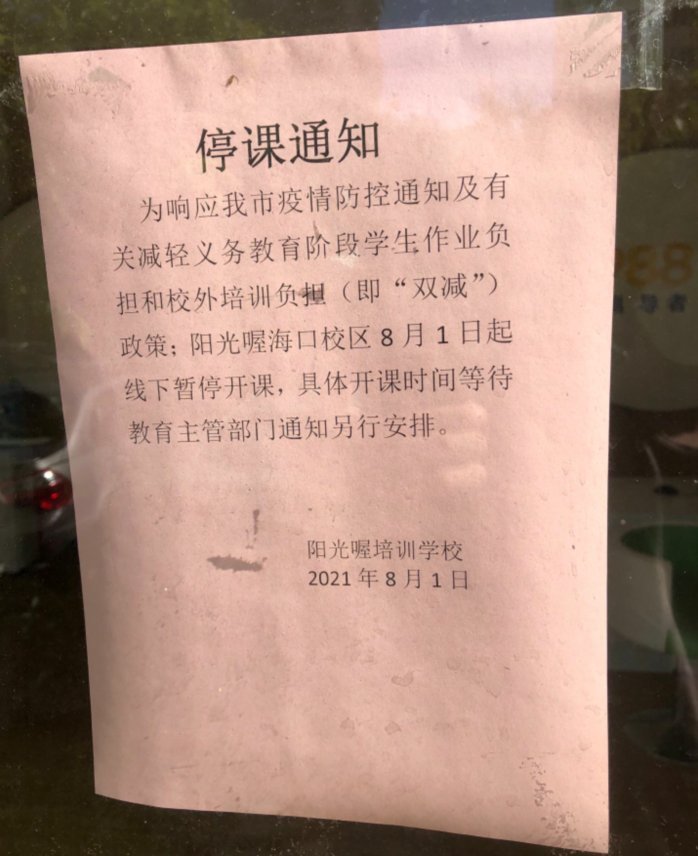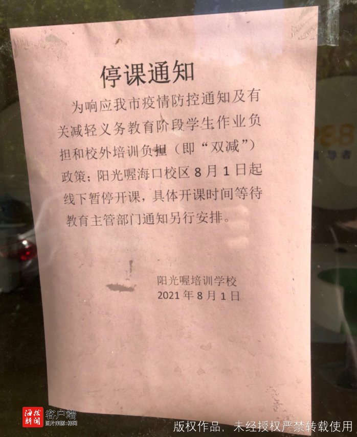 9月3日上午,记者来到位于海口市美兰区海甸岛寰岛大厦一层的阳光喔生态语文学习中心(海甸校区),该培训机构大门紧闭,玻璃门内空无一人,门上贴着8月1日发布的停课通知,称“为响应市疫情防控要求及‘双减’政策,学校暂停线下开课。”