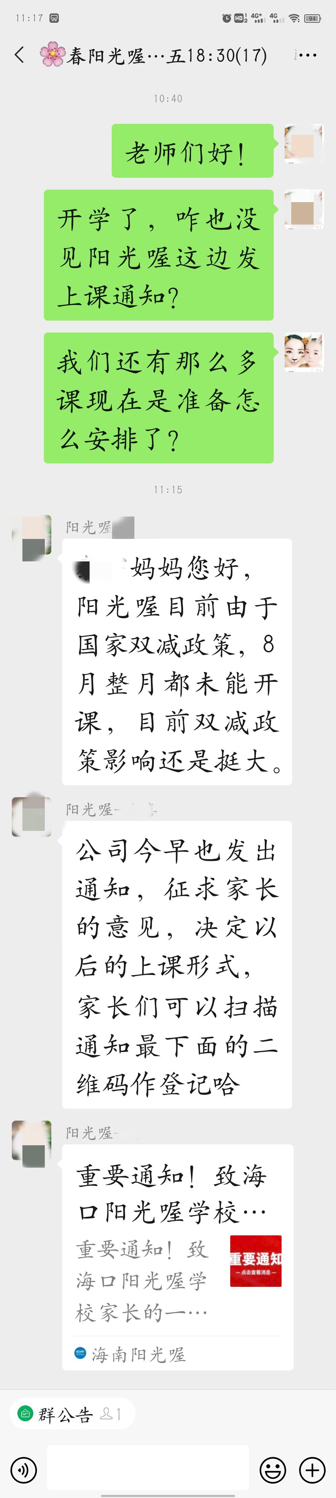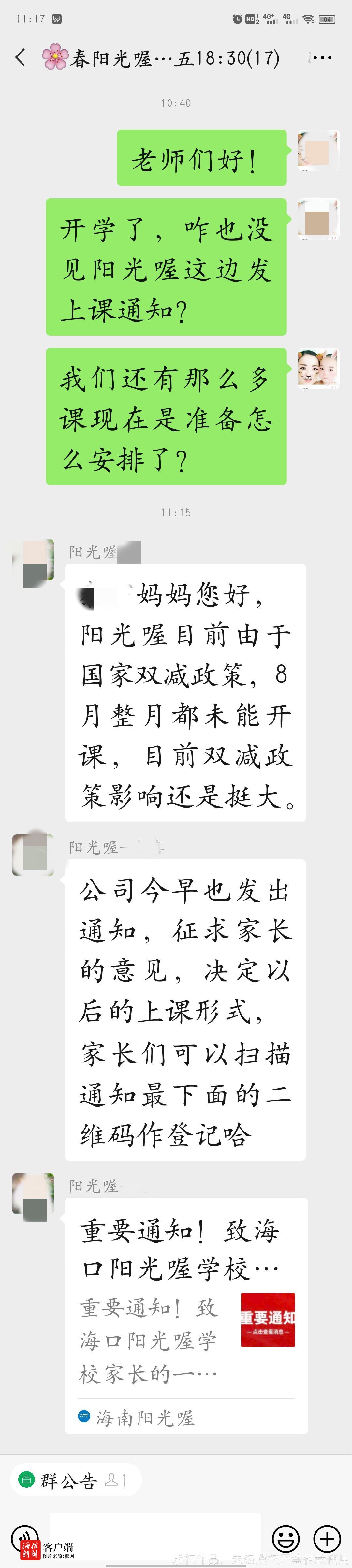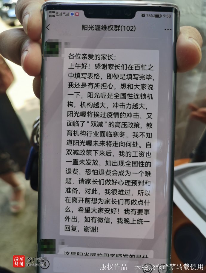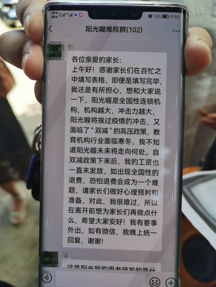 维权群的群主蒙女士告诉记者,停课后她联系了辅导班的教学老师,却被告知已经离职,且阳光喔已拖欠其两个月工资,正在走劳动仲裁。“我们这些家长中有的才刚刚续费,有的剩余培训费用破万元,打总部电话又说让我们先在公众号登记,没有准确时间,客服和联系人都让我们等,校区负责人也联系不上,那么多钱总不能一直让我们干等下去,究竟是什么情况必须给个说法。”蒙女士说道。