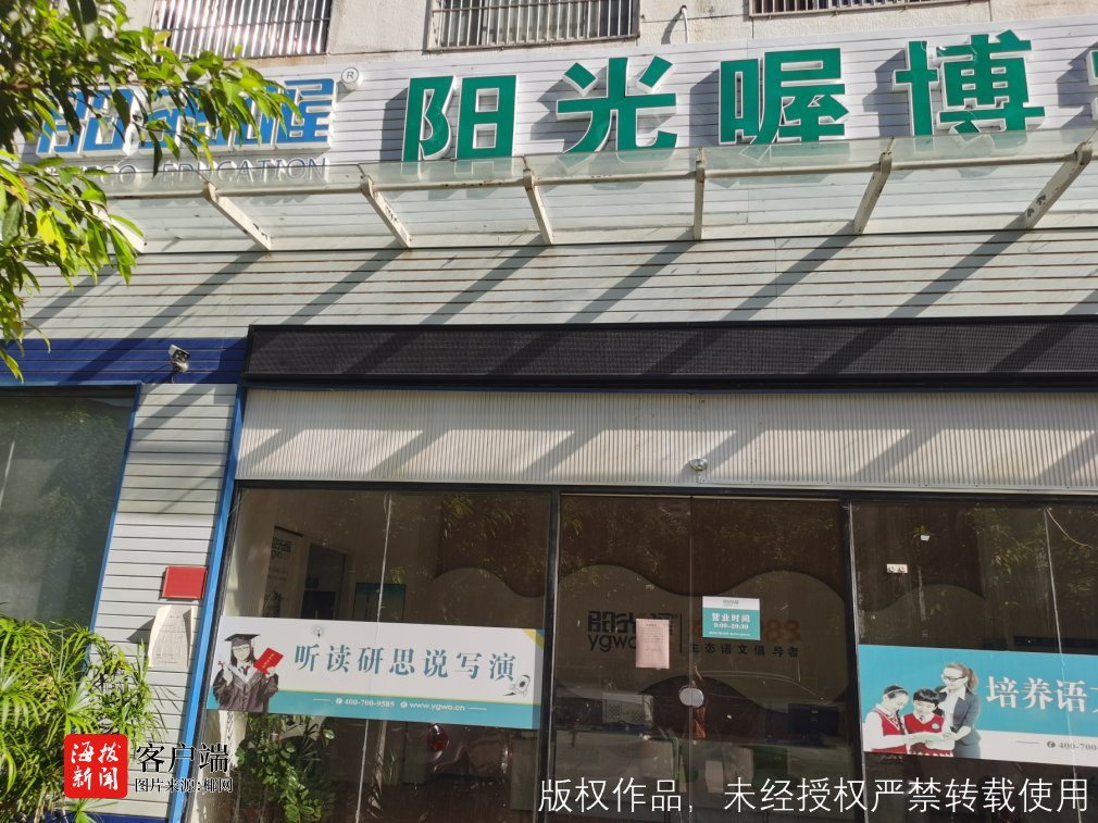 商报全媒体讯(椰网/海拔手机端记者 鲁启兰 柯育超 摄影报道)9月1日,“海南阳光喔”在其官方微信公众号发布《重要通知!致海口阳光喔学校家长的一封信》,宣布自即日起,阳光喔海口学校暂时歇业,暂停复课。培训机构停课,校区大门紧闭,上百位家长的培训费未退还,联络人无法给出准确退钱时间,超50万元的培训费究竟该找谁拿?