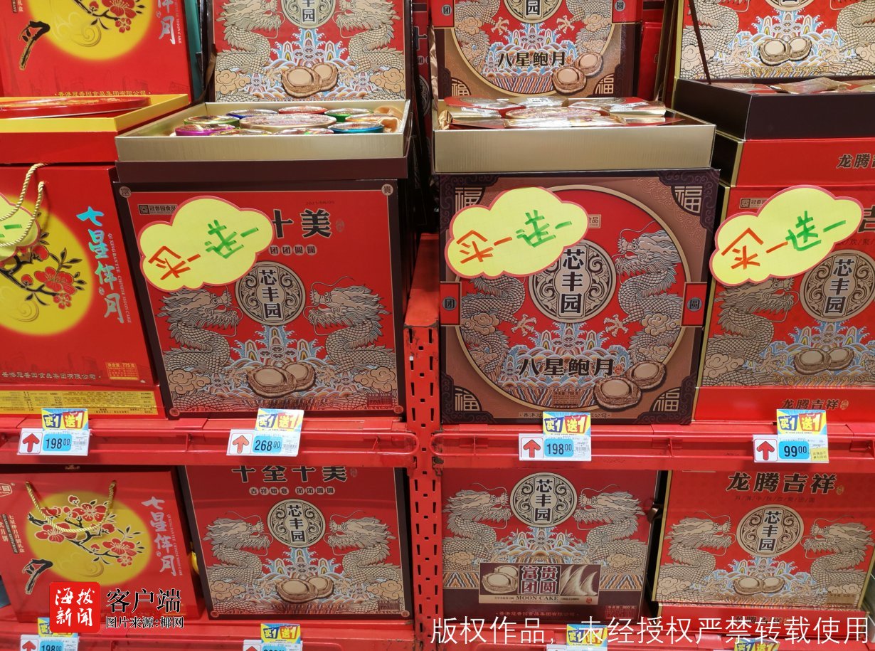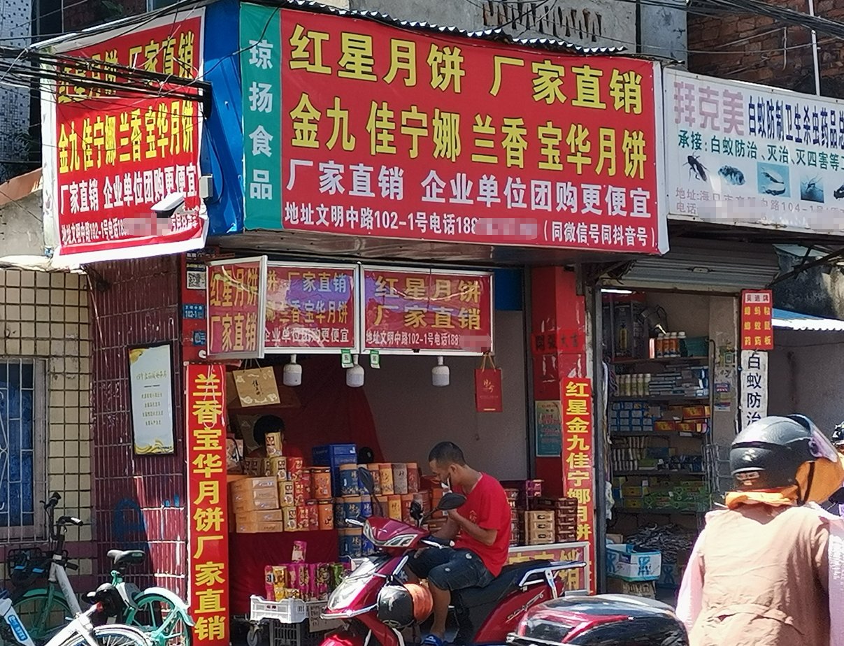 在文明中路102-1号厂家直销店,货架上摆满了海南琼式月饼,如琼珍月饼、佳宁娜月饼、宝华月饼、兰香月饼;还销售广东省的金九月饼。店员告诉记者:“本地人很爱吃红星月饼和宝华月饼。”