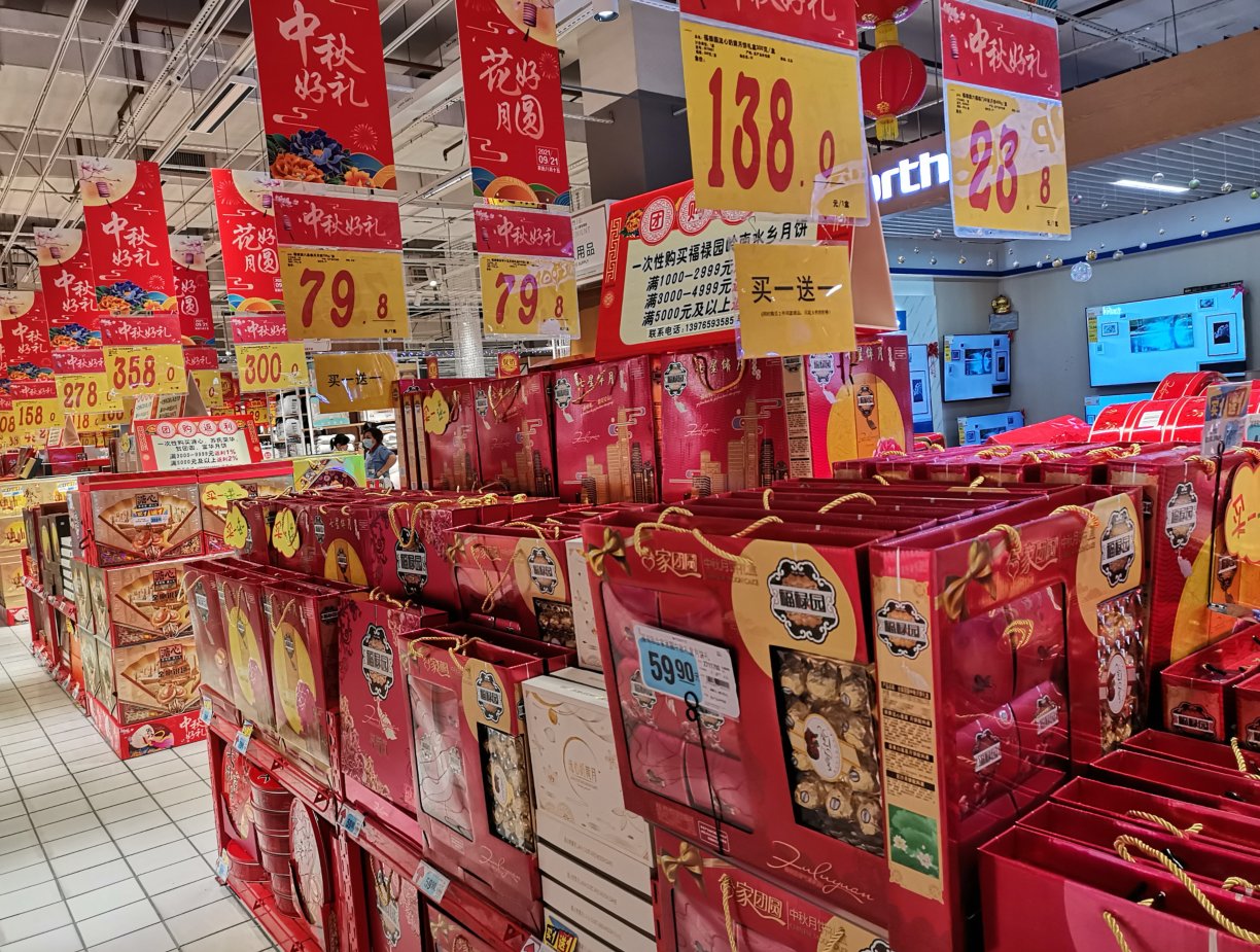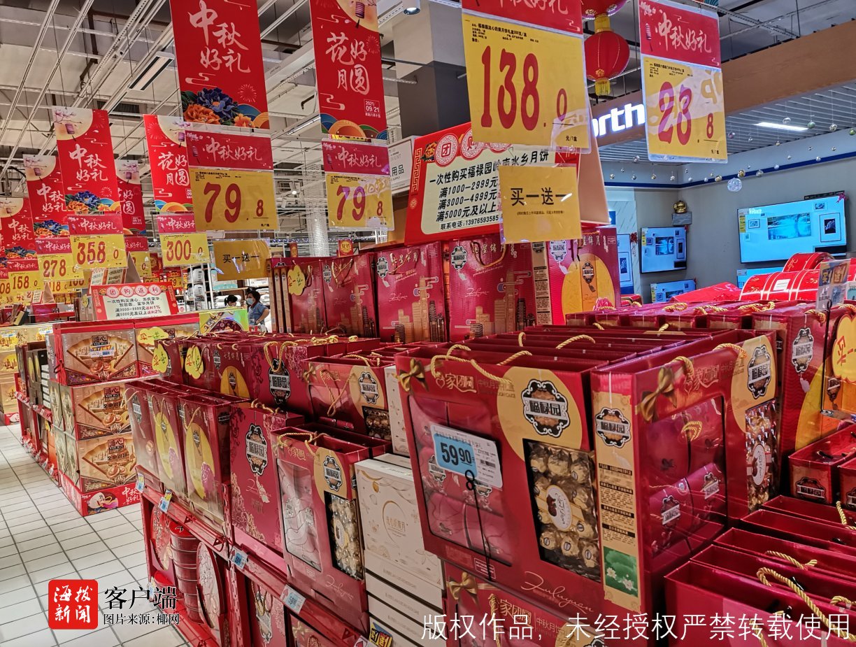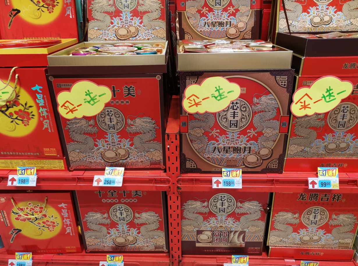 国兴大润发店二楼,月饼专区从门口延伸至超市食品专区,有盒装的、也有散装的。盒装的团购和返利活动较多。如:芯丰园价格为268元的十全十美月饼、198元的八星鲍月月饼、198元的七星伴月月饼、99元的龙腾吉祥月饼均参与买一送一活动。