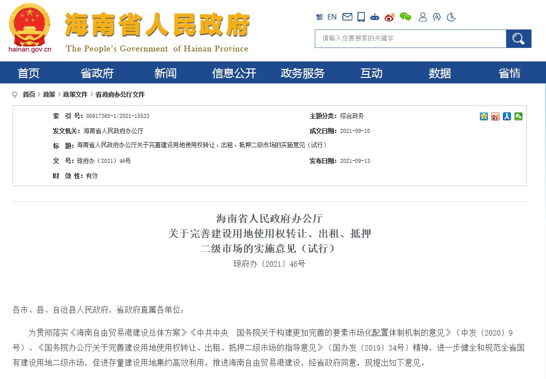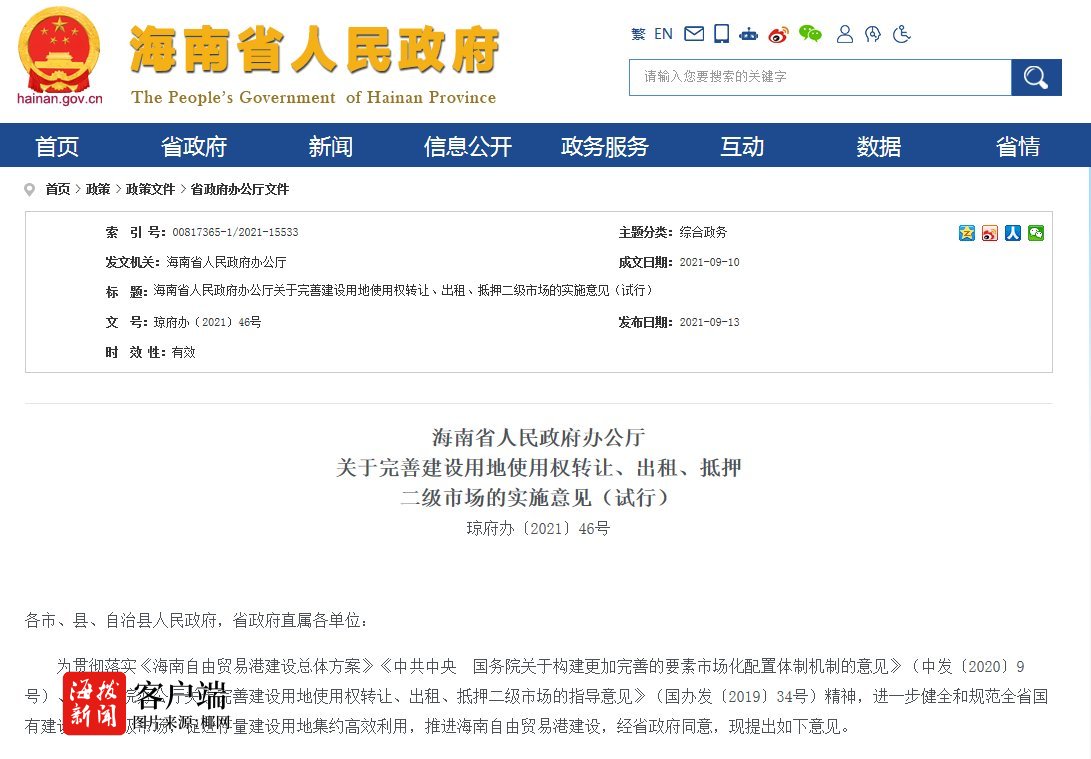 商报全媒体讯(椰网/海拔手机端记者 史若木)9月13日, 海南省政府办公厅印发《关于完善建设用地使用权转让、出租、抵押二级市场的实施意见》(以下简称《意见》)。《意见》提出,建设用地使用权转移的,地上建筑物、其他附着物所有权应一并转移;房地产转让涉及到相关法律法规规定需要办理相关手续的,从其规定。《意见》即日起施行,有效期3年。