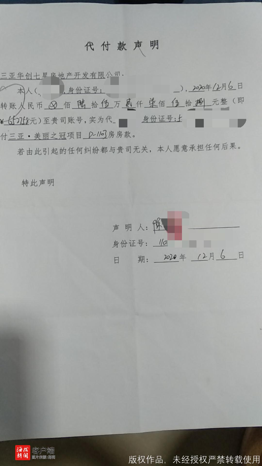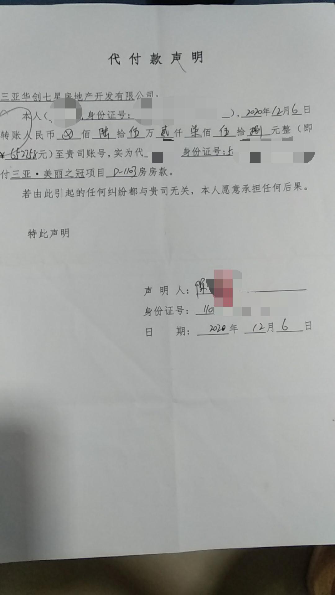据路女士回忆说,去年12月6日,在她们付完全款后,德佑旅居案场工作人员方先生还让他们签署了一份《代付款声明》,写明代替朱某洪以65.2758万元的价格向七星房地产公司支付美丽之冠项目D-1103房房款,当时她以为这是开发商的例行操作,所以也没有产生怀疑。