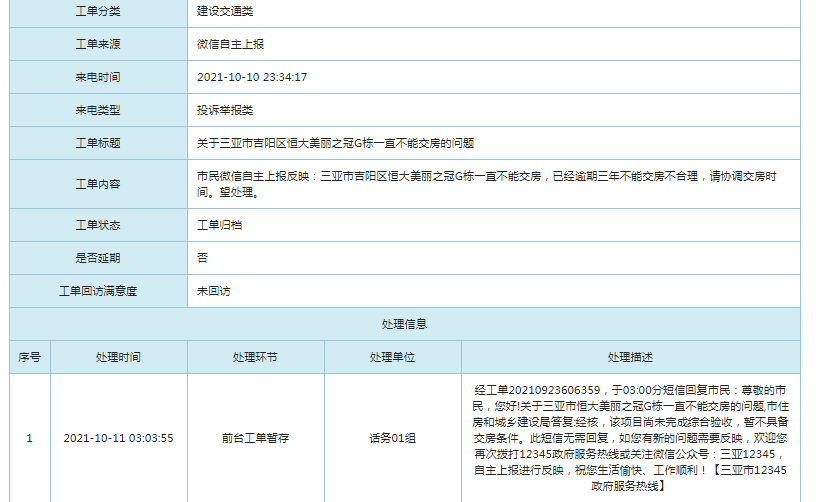 10月10日,一市民微信自主上报反映:三亚市吉阳区恒大美丽之冠G栋一直不能交房,已经逾期三年不能交房不合理,请协调交房时间。三亚市住房和城乡建设局答复称:经核,该项目尚未完成综合验收,暂不具备交房条件。