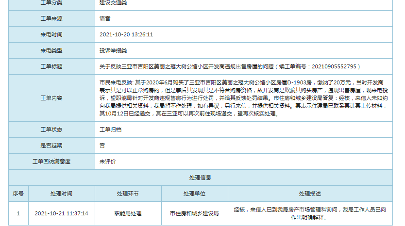 记者查询三亚市政府服务热线发现,有不少群众反映三亚市吉阳区美丽之冠大树公馆小区开发商违规出售房屋以及未交房问题。10月20日,一名投诉人称其去年6月购买了D-1903房,缴纳了20万元,当时开发商表示其是可以正常购房的,但是事后其发现其是不符合购房资格,故开发商是欺骗其购买房产,违规出售房屋,望职能局针对开发商违规售房行为进行处罚,并给其反馈处罚结果。