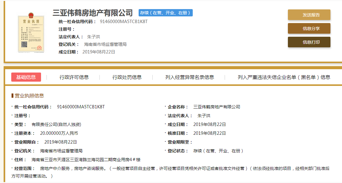 记者工商信息查询朱某洪发现,她任职于三亚伟鹤房地产有限公司,担任法定代表人以及执行董事兼总经理,该公司于2019年8月22日在三亚成立,为自然人独资公司,注册资本20万元,无固定营业期限。