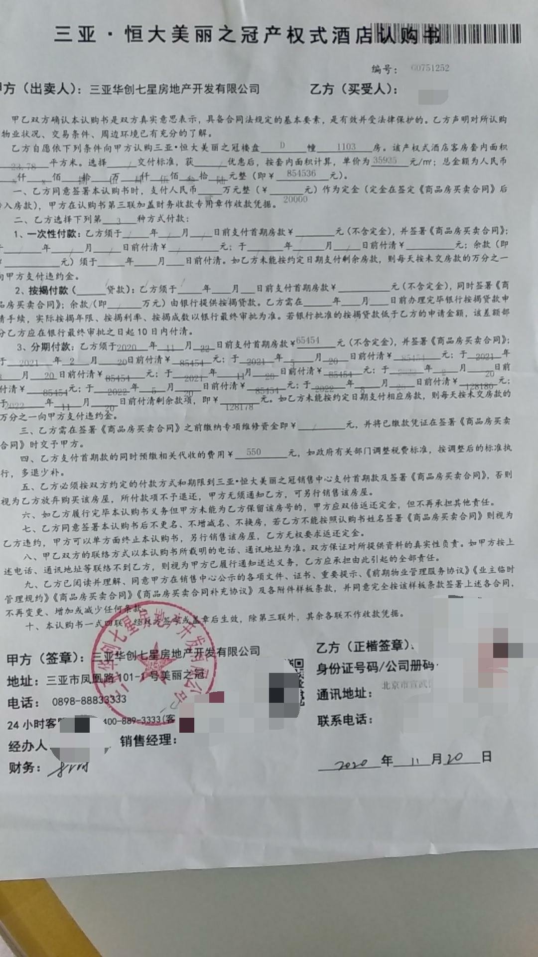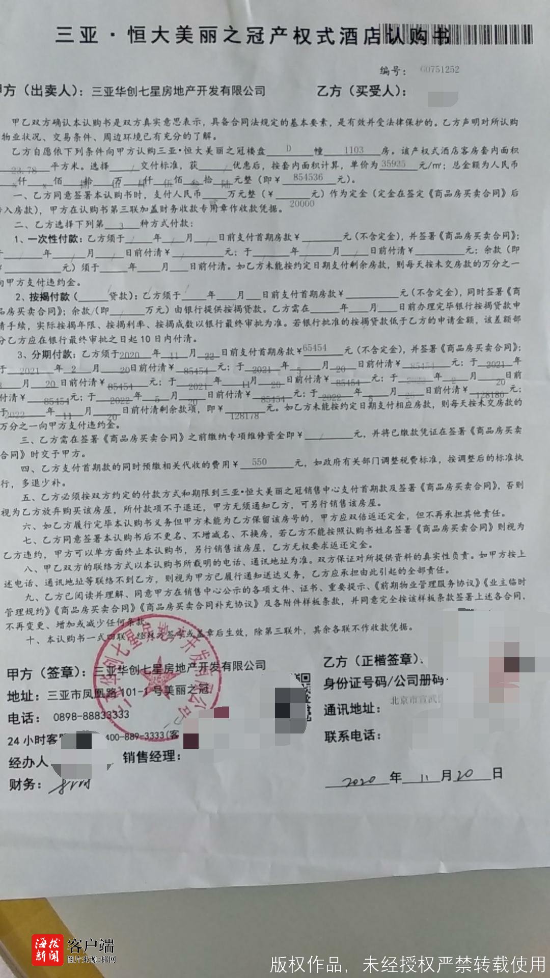商报全媒体讯(椰网/海拔手机端记者 谢佳宁 李莎 摄影报道)10月27日,路女士向国际旅游岛商报反映称,自己去年底在三亚全款购买了美丽之冠D栋一套33平方米的产权式酒店房源,而在签预售协议时她却发现房子的朝向由看房时所看的朝南变为了朝北,而后续沟通中,德佑旅居案场负责人告诉她,开发商认为,路女士现在要是调换朝南户型需得支付近20万元款项才行。随着记者调查的深入,发现中介存在包销炒房赚巨额差价和诱导不具备购房资格的岛外居民违规购房行为。三亚市房地产交易中市场科表示,外地人在三亚购买产权式酒店的政策条件和住宅销售一样,也是限购的,因此路女士并不具备三亚购房资格,发现将严肃查处。