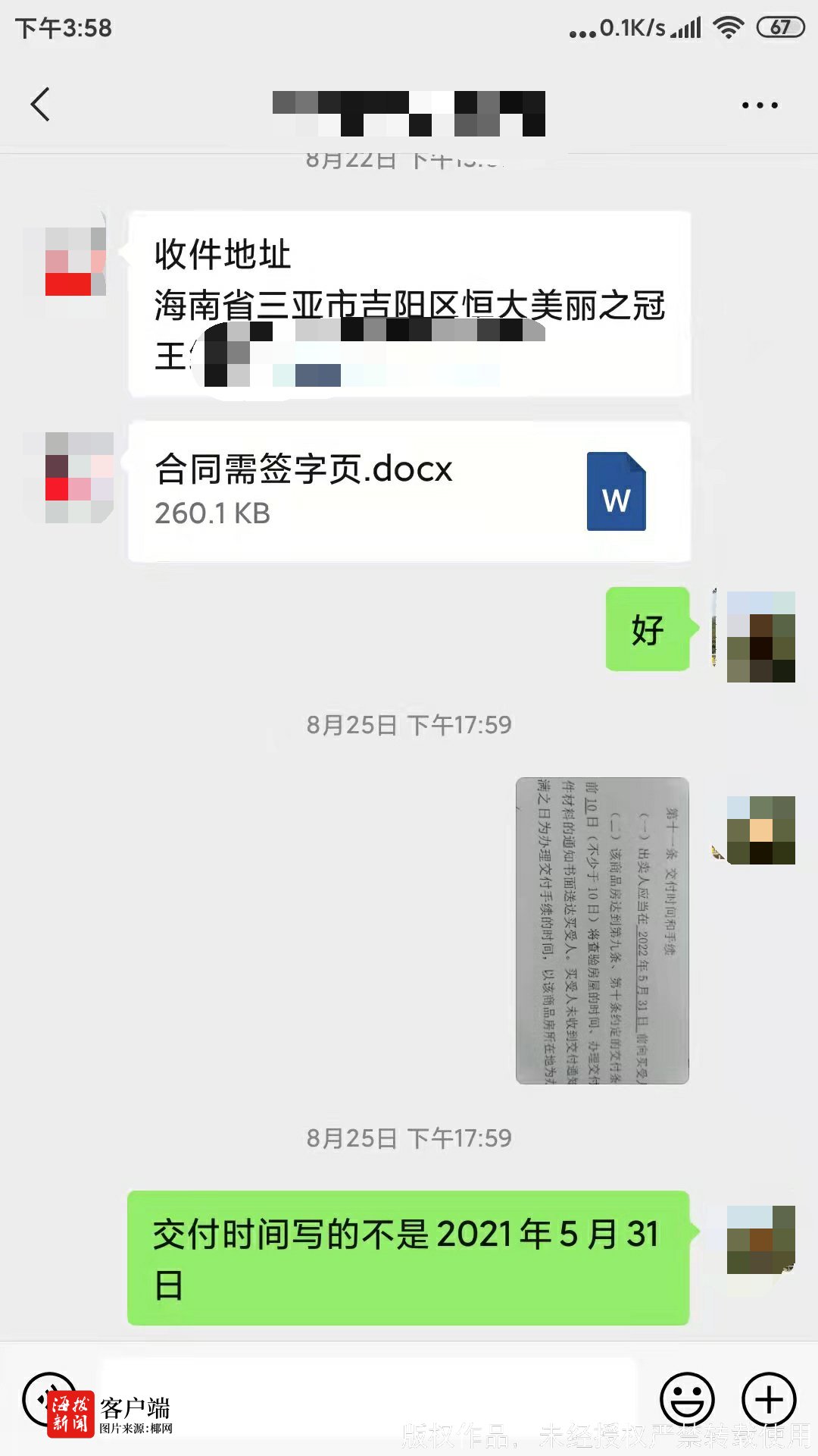 10月9日,市民投诉称,其于2020年10月购买吉阳区凤凰路美丽之冠D栋10楼13房,合同告知2021年5月份交房,至今未交房,咨询开发商也是未告知具体交房时间。三亚市住房和城乡建设局称,开发企业反馈称,项目正在竣工验收,暂无具体交房时间。