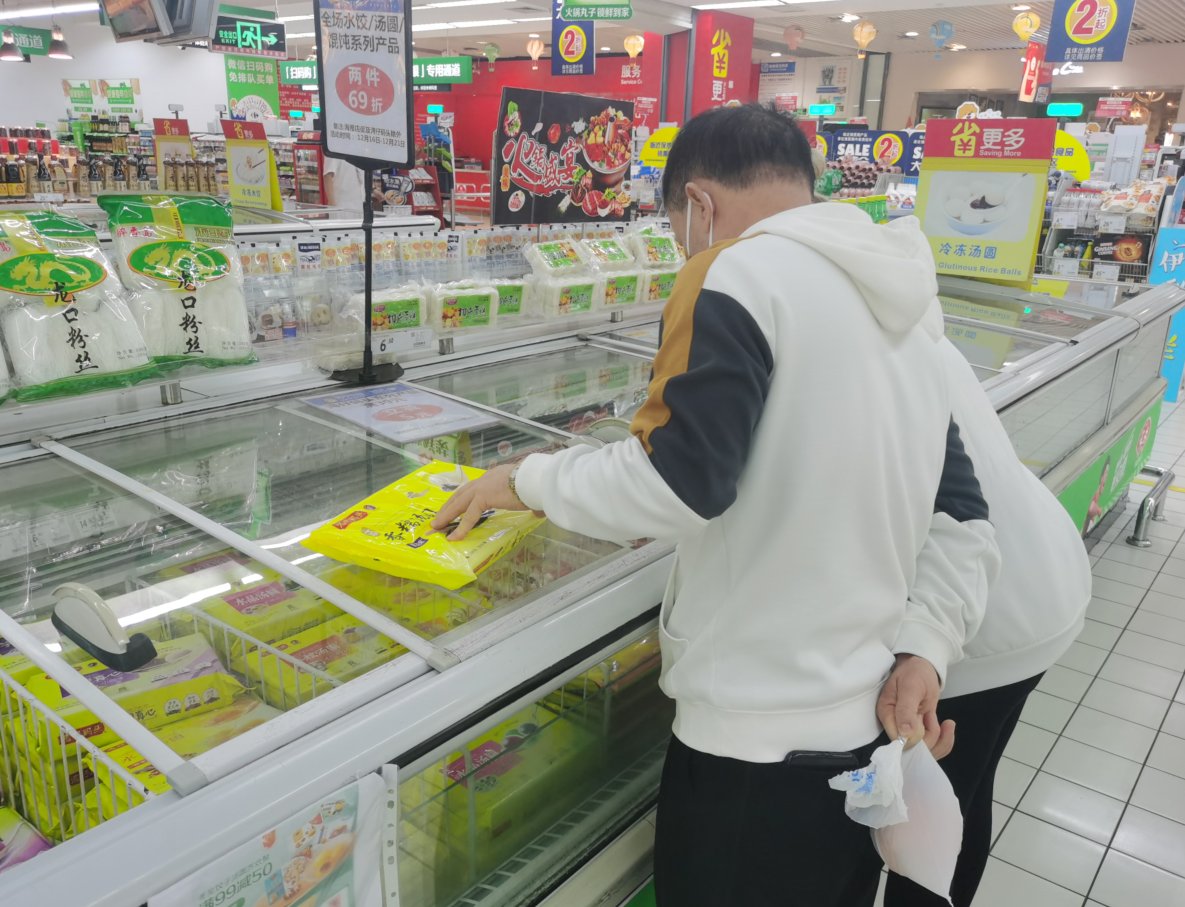 21日下午,记者来到海口家乐福(南亚广场店)看到,已有不少市民正在冰柜附近进行选购。“天冷了,买几包汤圆,家里人一块吃点热乎的。”陈阿伯告诉记者,家里每年冬至都会一块儿吃汤圆,所以今天特地来买几包芝麻馅儿的。