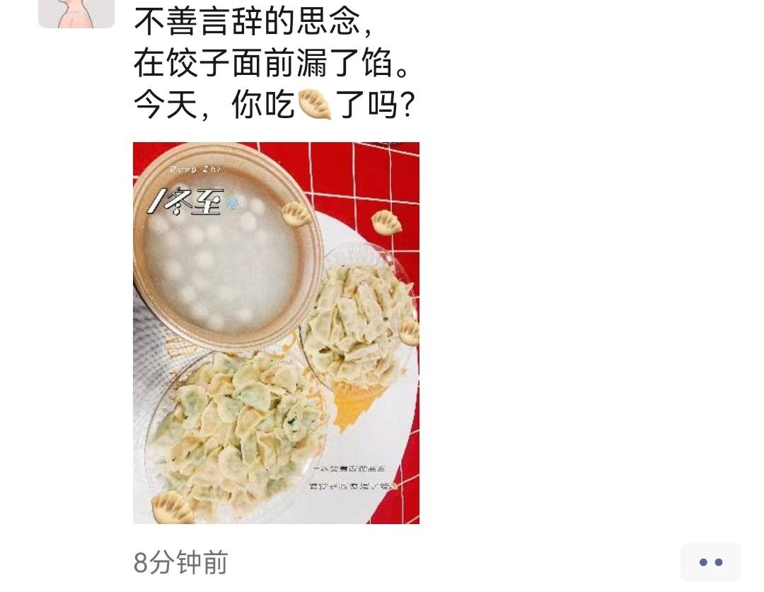 除此之外,还有不少朋友在朋友圈中晒出自己的“冬至菜单”,在冬至这天,吃上一碗热乎乎的饺子或汤圆,充满了仪式感,也祝愿未来的日子甜蜜美满。