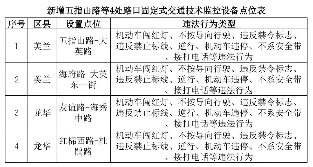 商报全媒体讯(椰网/海拔手机端记者 陈勇合)1月21日,国际旅游岛商报记者从海口公安交警支队获悉,根据公安部《非现场查处道路交通安全违法行为操作规程(试行)》(公交管[2020]73号)第三章第一节第十二条条规定,将海口新增的固定式交通技术监控设备予以公布。据了解,本批共新增4处电子警察,并于2022年1月31日正式投入使用。