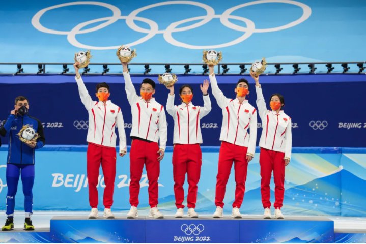 当中国短道速滑接力队最终赢下了这枚“一波三折”的金牌,最终站上领奖台的队员一共有五位——武大靖、任子威、范可新、曲春雨和张雨婷。