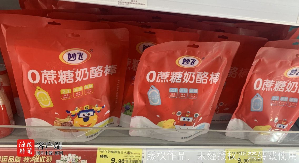 记者针对张先生所投诉的情况,实地走访了海甸城的万家惠超市。在超市的生鲜区,记者一眼就看到了冷藏柜内妙飞奶酪棒。奶酪棒摆在显眼的位置,有多种口味及品类,而张先生所购买投诉的是妙飞0蔗糖奶酪棒,标价特价9.9元。由于万家惠的门店店长不在店内,记者通过电话向他了解情况。