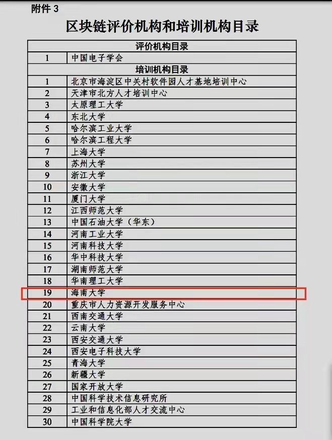 商报全媒体讯(椰网/海拔手机端记者 鲁启兰 通讯员 李天畅)近日,人社部中国就业培训技术指导中心公示了数字技术工程师培育项目首批培训机构名单,海南大学顺利入围,成为海南省内首批数字技术工程师培育项目区块链方向唯一培训机构。该项目由海南大学继续教育学院、计算机科学与技术学院联合申报。