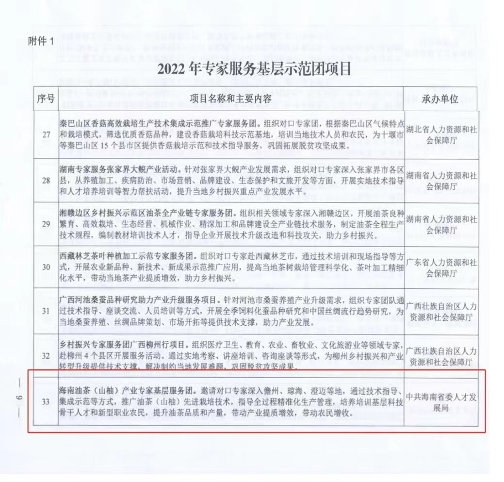 商报全媒体讯(椰网/海拔手机端记者 鲁启兰 通讯员 李天畅)近日,人力资源和社会保障部办公厅公布了2022年专家服务基层示范团项目和国家级专家服务基地名单。海南大学组织实施的“海南油茶(山柚)产业专家基层服务团”成功入列2022年专家服务基层示范团项目。