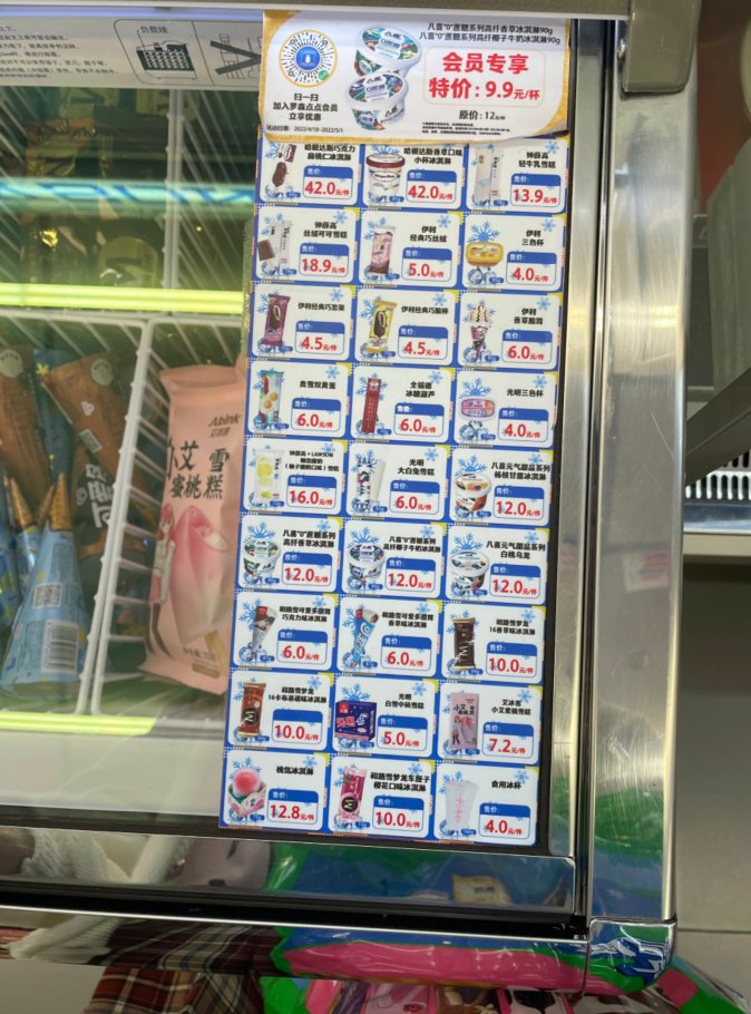 “贵肯定会有贵的价值在里面,好吃才会贵呀,现在很多雪糕都有优惠价,这个口味现在打折,没剩下多少支了。”该售货员向记者推荐了钟薛高“半半巧巧雪糕”及“有芝红茶雪糕”,售价分别为9.9元及13.5元,其中“半半巧巧雪糕”原价为14.8元,“有芝红茶雪糕”原价为15.9元。