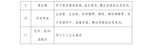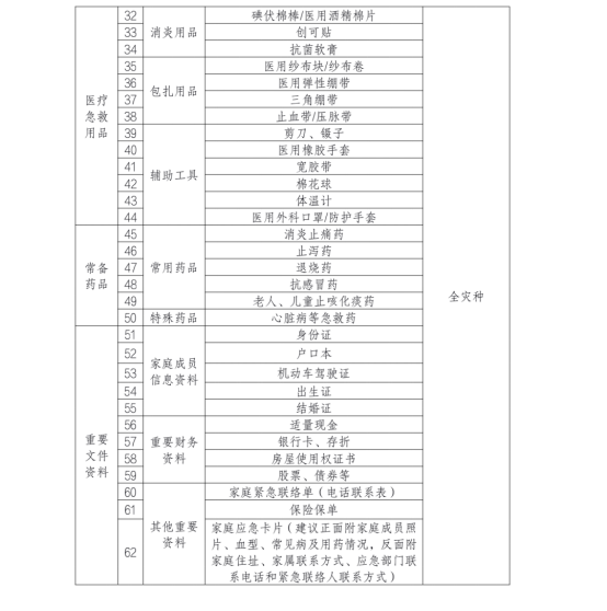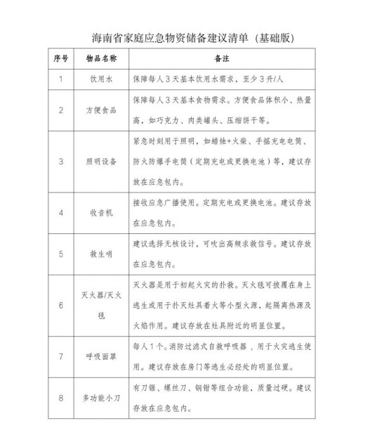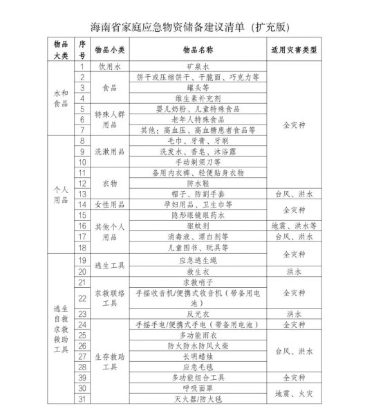 受新冠肺炎疫情和极端天气等自然灾害影响,应急物资储备成为每个家庭的必要选择。海南省结合我省灾害实际情况,省减灾办制定了《海南省家庭应急物资储备建议清单》, 《海南省家庭应急物资储备建议清单》内容分为基础版和扩充版两个版本。扩充版是在基础版上进行扩充,用来满足更全面及特殊人群的应急需求,主要包括水和食品、个人用品、逃生自救(求救、救助)工具、医疗急救用品、常备药品和重要文件资料等6大类共计62种物资。